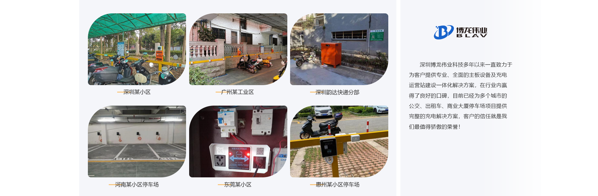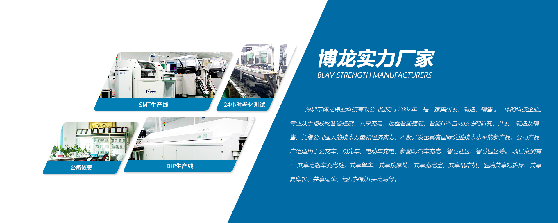 深圳市博龍偉業(yè)科技有限公司創(chuàng)辦于2002年,是一家集研發(fā)、制造、銷售于一體的科技企業(yè)。專業(yè)從事物聯(lián)網(wǎng)智能控制、共享充電、遠(yuǎn)程智能控制、智能GPS自動(dòng)報(bào)站的研究、開發(fā)、制造及銷售,憑借公司強(qiáng)大的技術(shù)力量和經(jīng)濟(jì)實(shí)力,不斷開發(fā)出具有國(guó)際先進(jìn)技術(shù)水平的新產(chǎn)品。公司產(chǎn)品廣泛適用于公交車、觀光車、電動(dòng)車充電、新能源汽車充電、智慧社區(qū)、智慧園區(qū)等。 項(xiàng)目案例有: 共享電瓶車充電樁,共享單車、共享按摩椅、共享充電寶、共享紙巾機(jī)、醫(yī)院共享陪護(hù)床、共享復(fù)印 機(jī)、共享雨傘、遠(yuǎn)程控制開頭電源等。